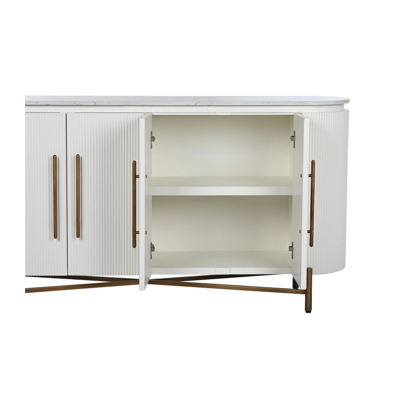Aparador de madera de abeto lacado blanco mate con sobre de mármol y patas de metal dorado