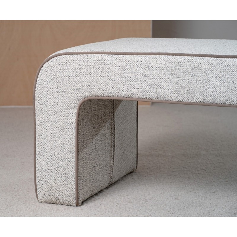 Banco acolchado tapizado en tono gris y marfil con vivo de terciopelo en color topo.