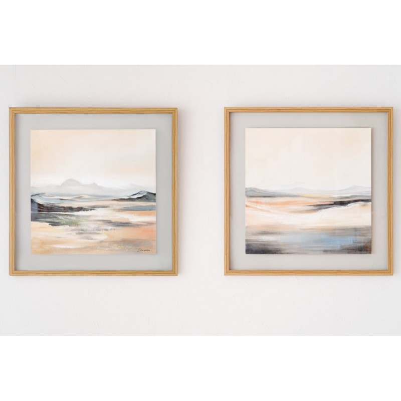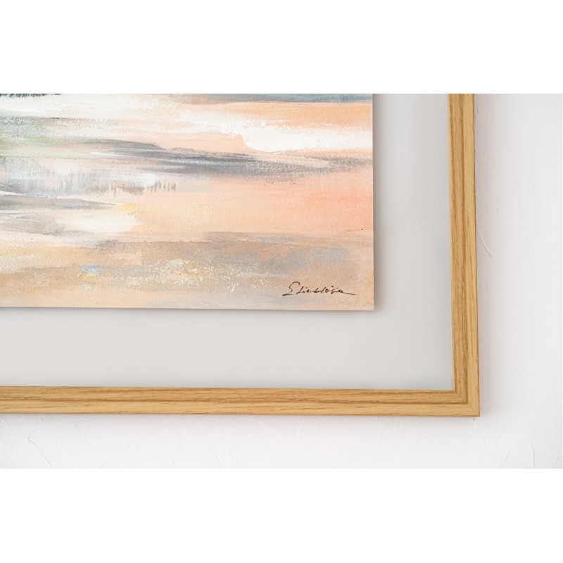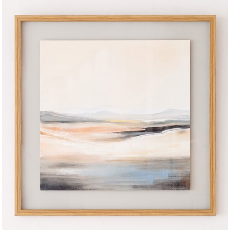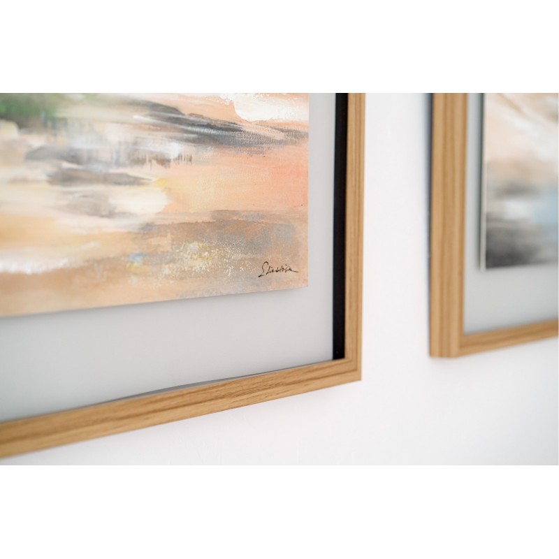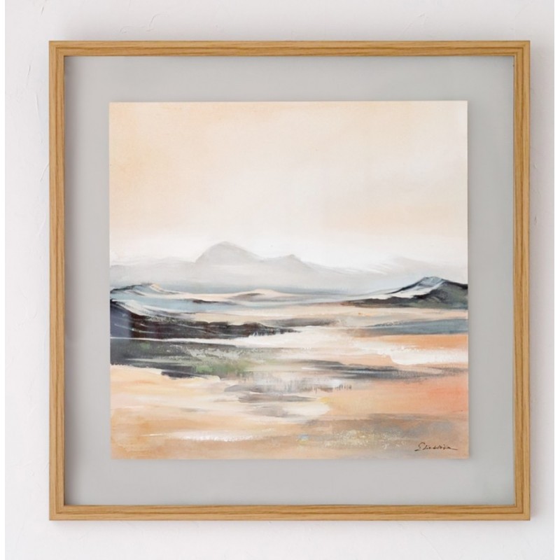EN EL MONTAJE DE ESTA PIEZA SE HA BUSCADO QUE LA PINTURA PAREZCA FLOTAR SOBRE EL FONDO. SE HA EMPLEADO UN PASPARTÚ EN UN SUAVE Y CÁLIDO TONO GRIS Y SE HA ENMARCADO CON CRISTAL Y MARCO EN COLOR MADERA CLARO.