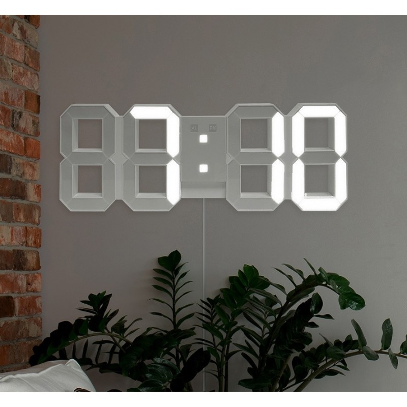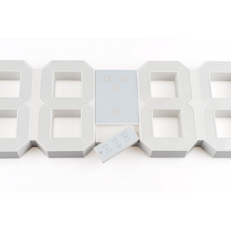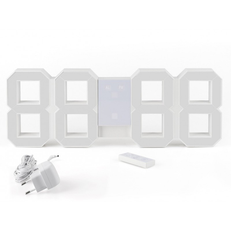 Despertador de pared con mando a distancia magnético integrado en el despertador. Función Snooze programable de 5 a 60 minutos. Transformador de 5V con cable de 3m incluido.