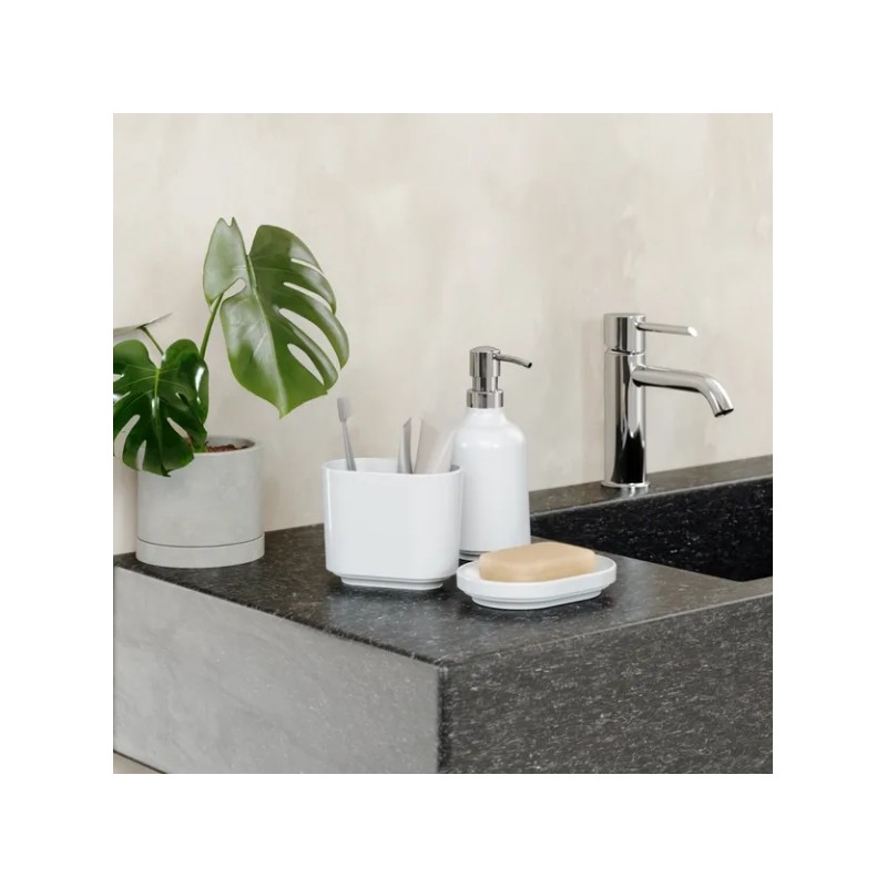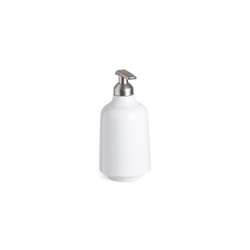 Dispensador de jabón blanco Step. Fabricado en melamina, un material muy resistente a caídas y ralladuras.
