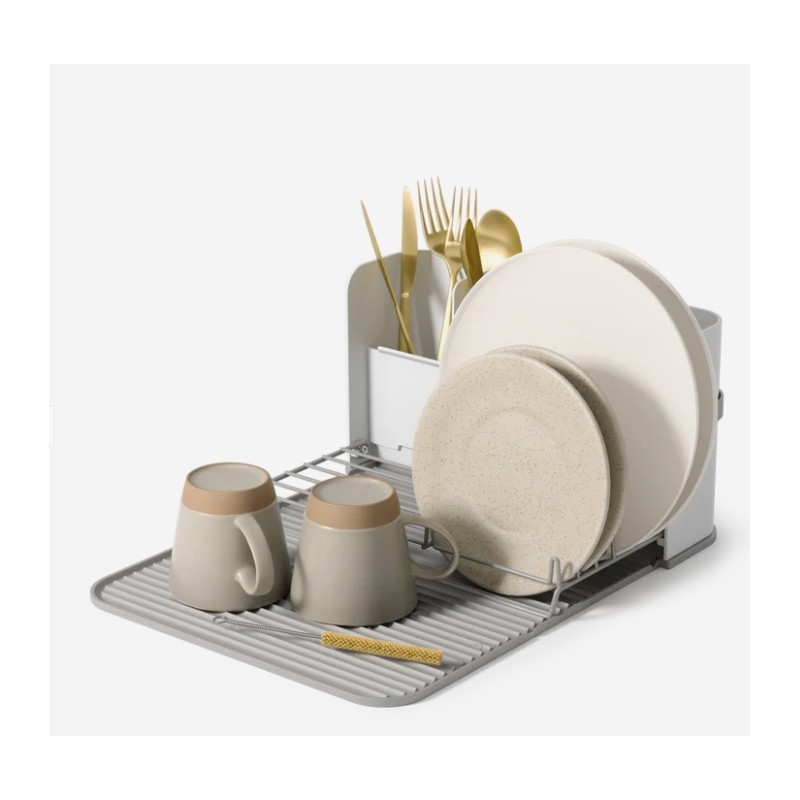 El ESCURRIDOR DE PLATOS SLING cuenta con una rejilla metálica plegable y un tapete plegable que encaja perfectamente en una cómoda base organizadora.