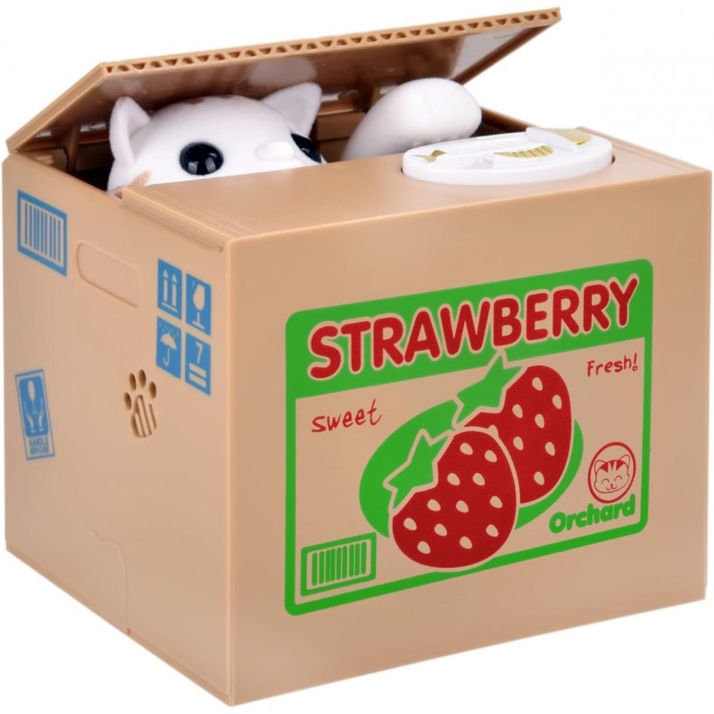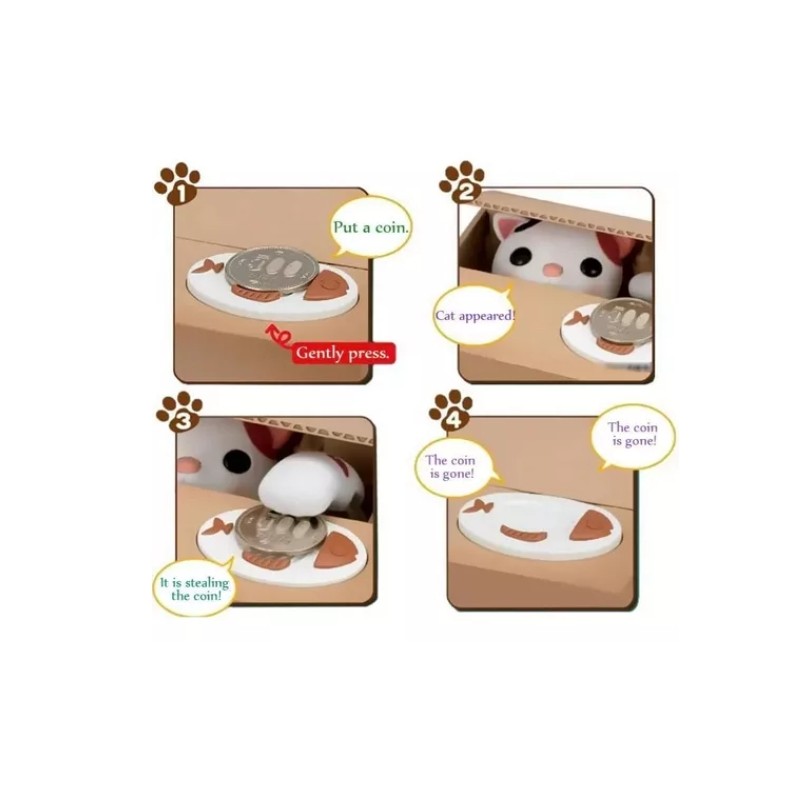 Hucha electrónica con gato roba dinero. Coloque la moneda en el plato blanco y presiónelo. El animalito saldrá y robará sus monedas a mano.