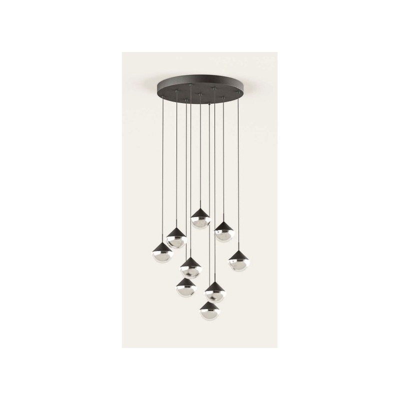Lámpara de techo LED con 9 pantallas de cristal óptico, que deja pasar la luz LED hacia la parte inferior y hacia los laterales de la lámpara.