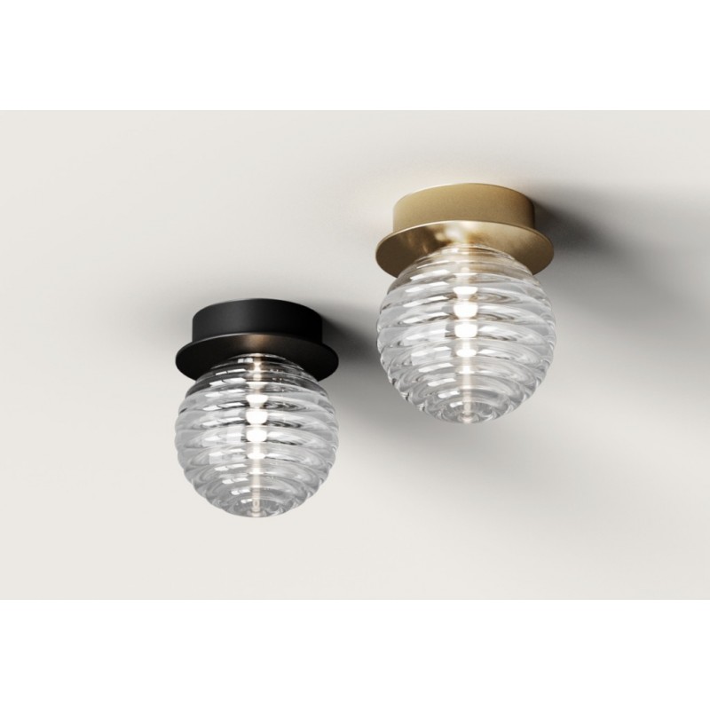 Aplique de techo compuesto por un soporte de acero disponible en 2 acabados negro mate y oro envejecido.