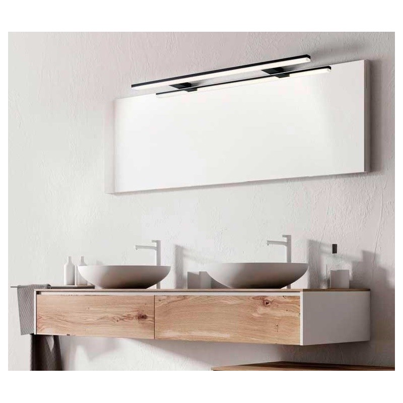 Lámpara de pared con LED integrado, especialmente diseñada para ajustarla en el baño. También se puede fijar en el armario o en el espejo. Protecciones IP44 y acabado en negro mate.