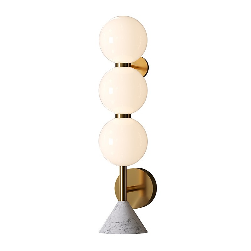 Aplique de pared formado por una estructura de esferas de cristal opal, rematada por detalles en mármol natural disponible en 2 acabados: