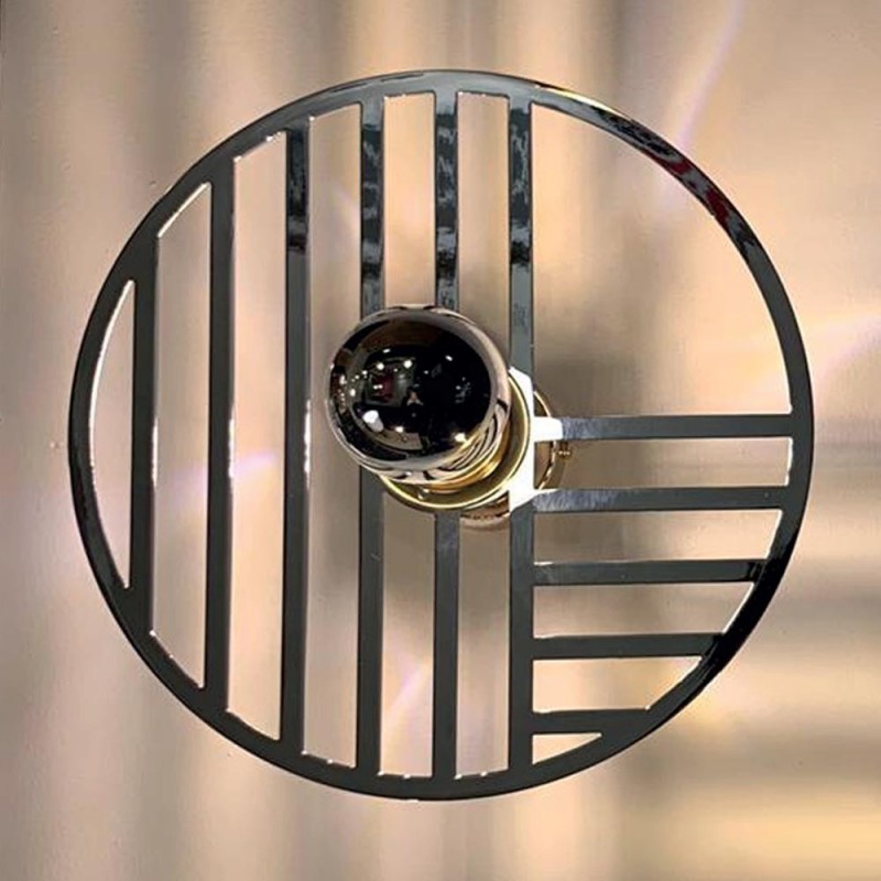 Aplique de pared formado por un portalámparas de acero de 5cm y un accesorio con forma de disco de acero rayado