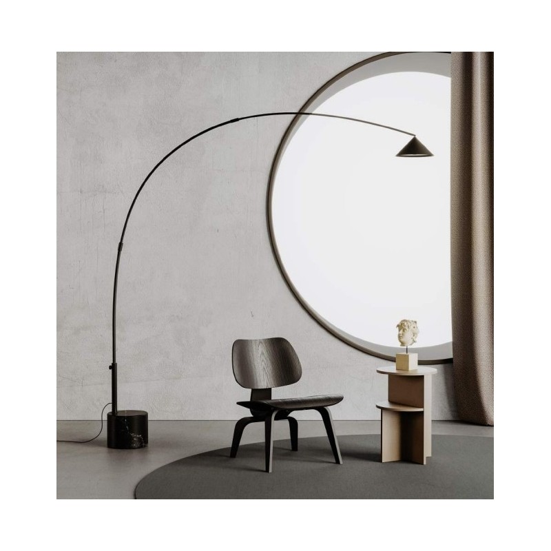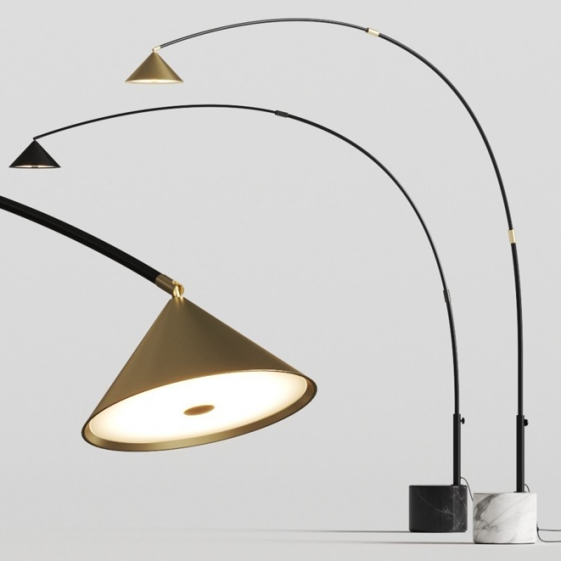 Lámpara de pie con estructura en negro mate, pie de mármol y pantalla en negro u oro mate.