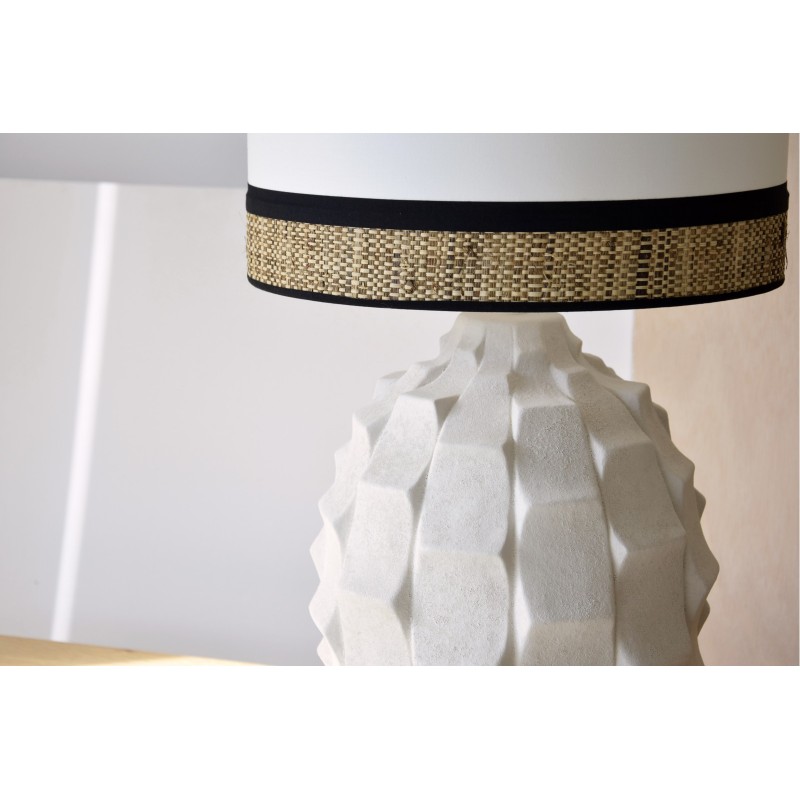 Lámpara con pie de cerámica rugosa. Pantalla cilíndrica de algodón blanco roto con vivo de rafia natural