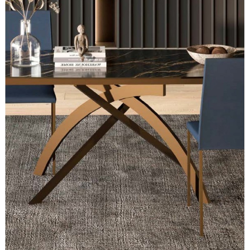 Mesa de comedor con estructura central cruzada en metal barnizado acabado bronce y sobre ovalado en cerámica acabado Noir Desire brillo.