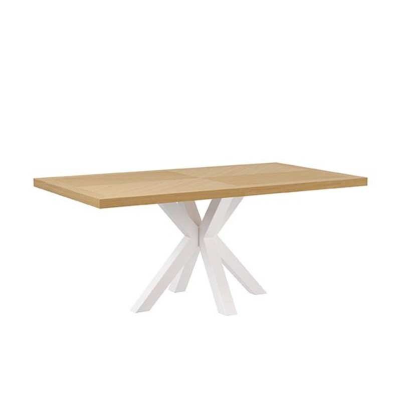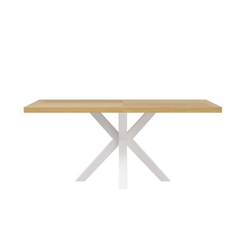 Las patas metálicas en blanco, de líneas limpias y firme presencia, contrastan con el tono madera de la superficie, creando un equilibrio perfecto entre estilo industrial y esencia escandinava.