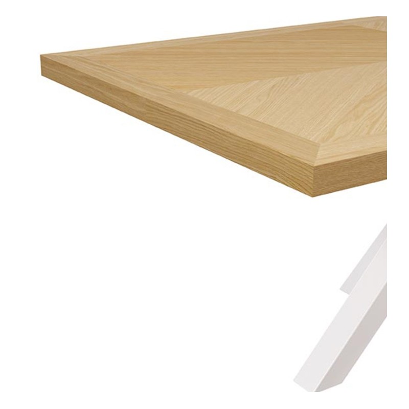 La mesa destaca por su diseño sobrio y contemporáneo, donde la calidez de la chapa de roble se encuentra con la solidez del metal para dar vida a una pieza de fuerte personalidad.