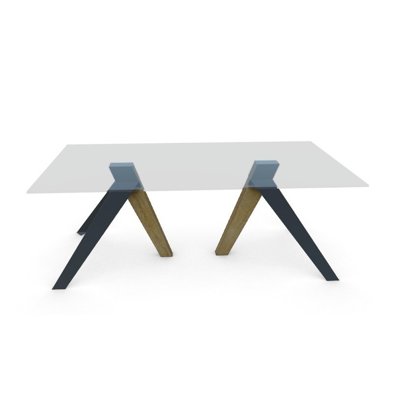 Elegante mesa fija con patas tridimensionales, dos en metal y una en madera maciza de roble natural. Sobre de cristal templado transparente de 12 mm.