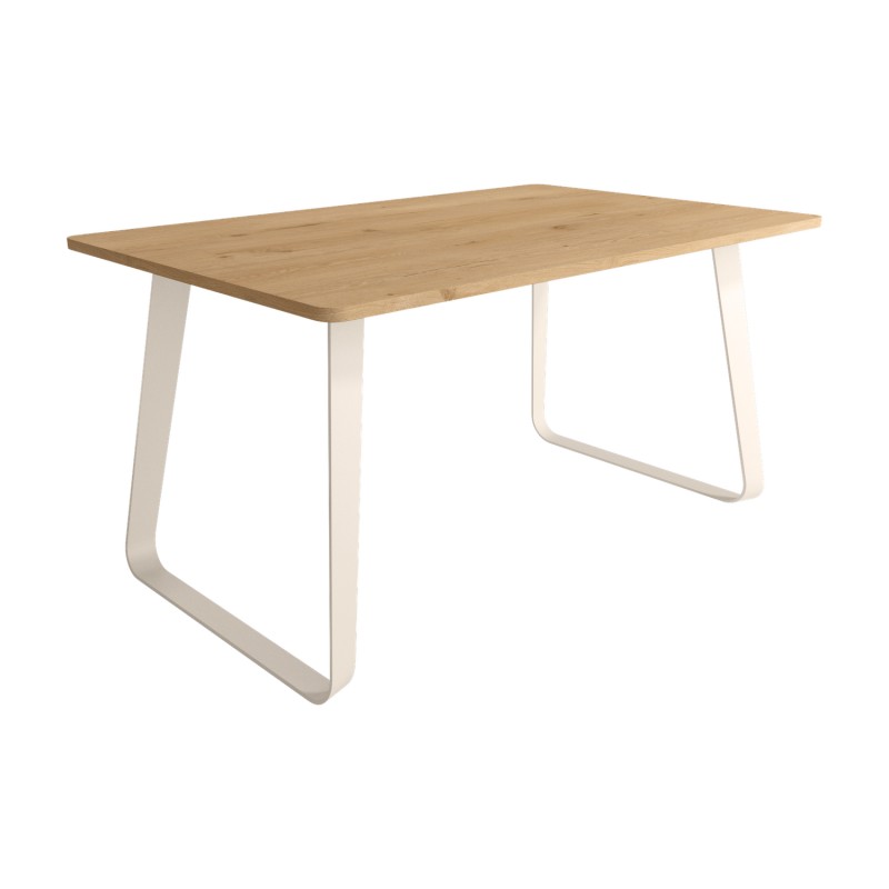 Mesa fija con estructura metálica marfil. Sobre de 22 mm con esquinas redondeadas en acabado melaminas.