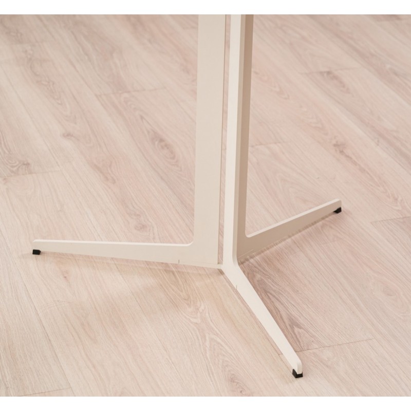 Mesa redonda de 90 cm de diámetro con sobre cerámico acabado terrazo en tonos grises enmarcado con una chapa metálica en color beige