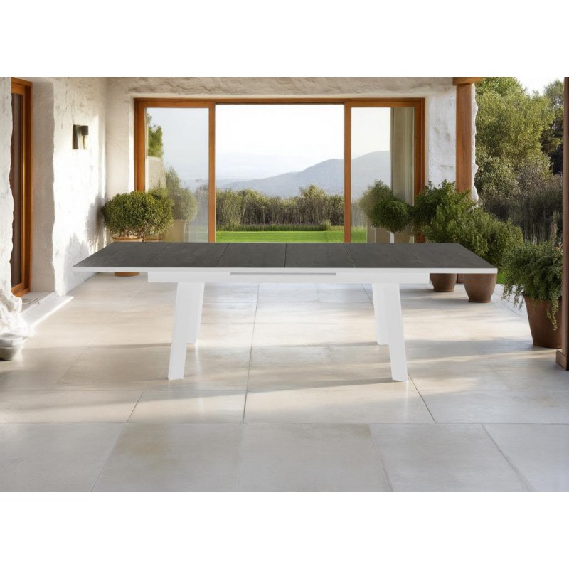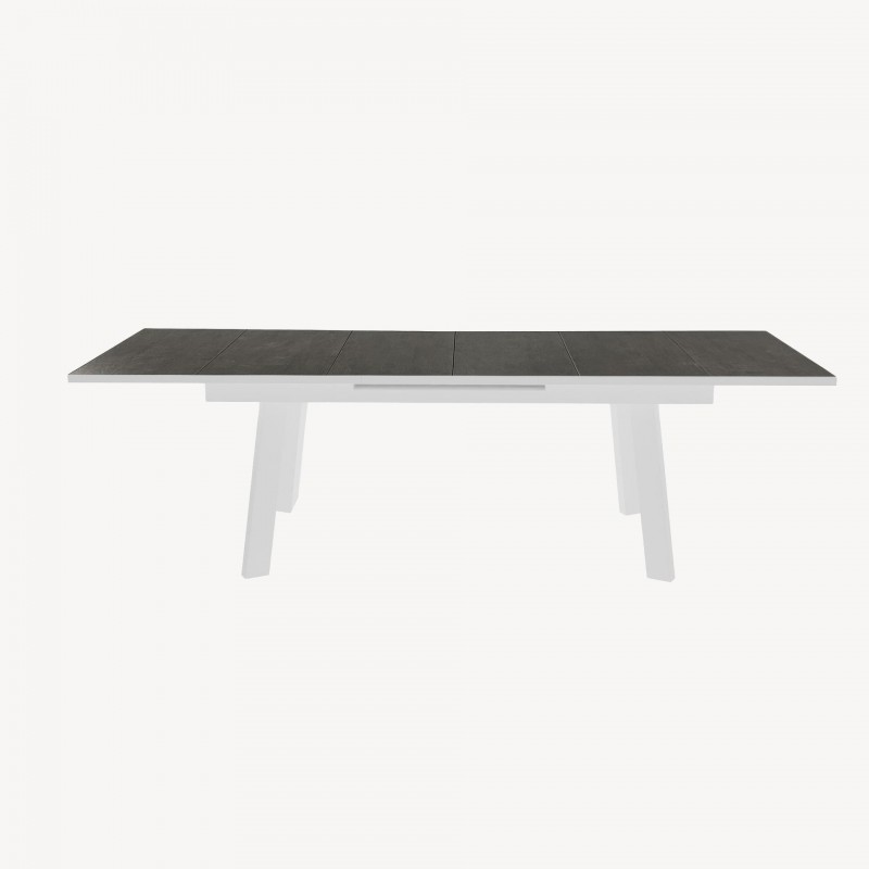 Su estructura de aluminio blanco garantiza ligereza y resistencia a la intemperie, mientras que la tapa de cerámica con efecto madera añade calidez y sofisticación al conjunto.