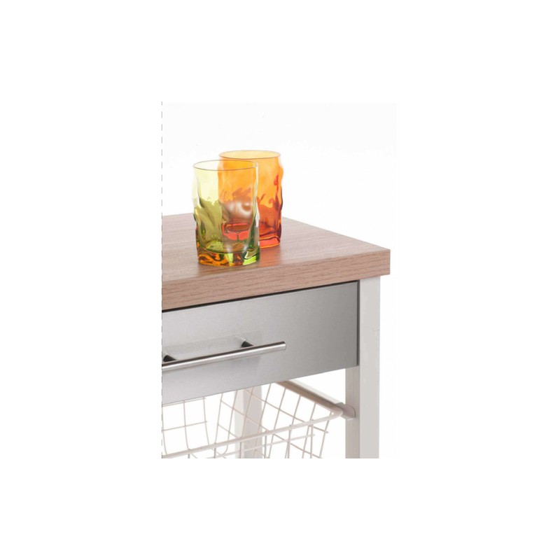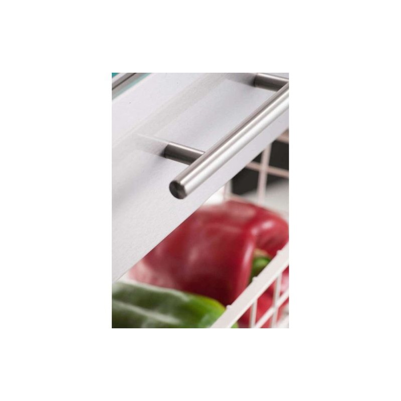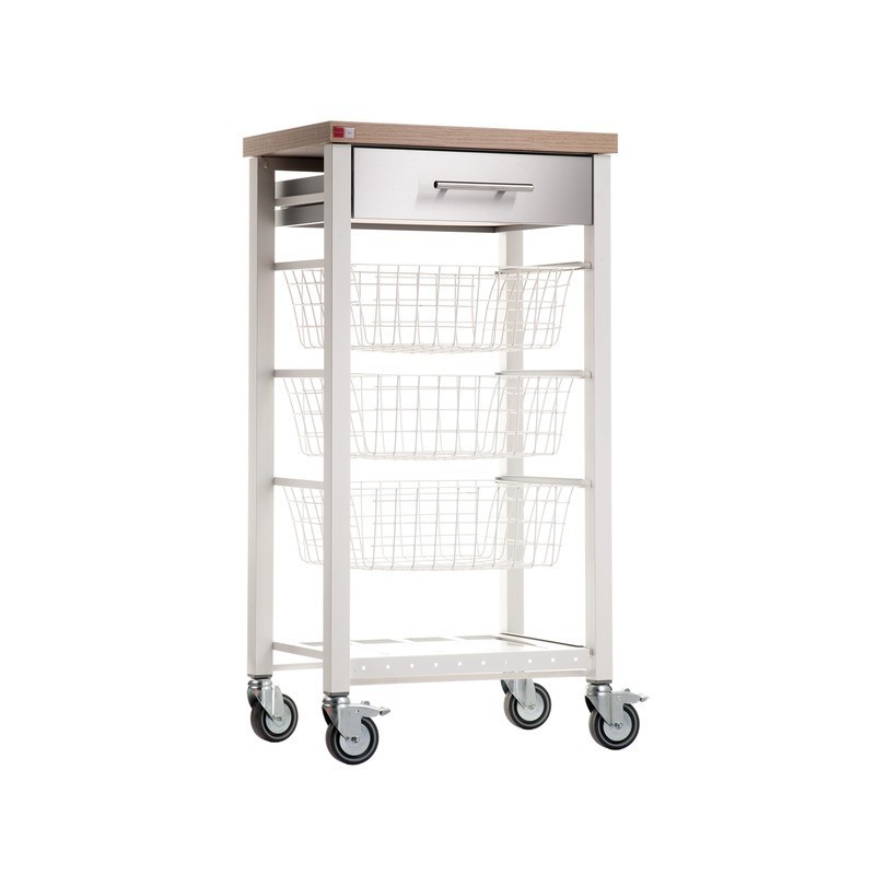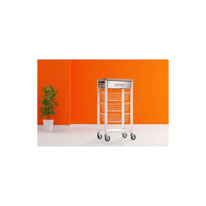 3 cestas de gran capacidad, ruedas, 1 cajón y 1 botellero. Frontal y asa del cajón en acero inoxidable.