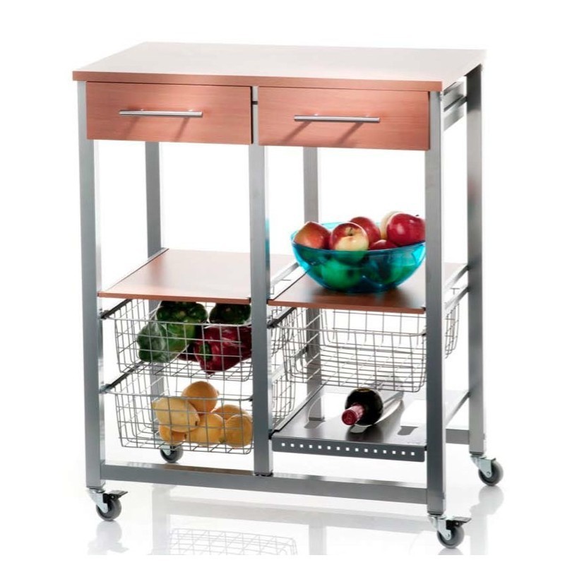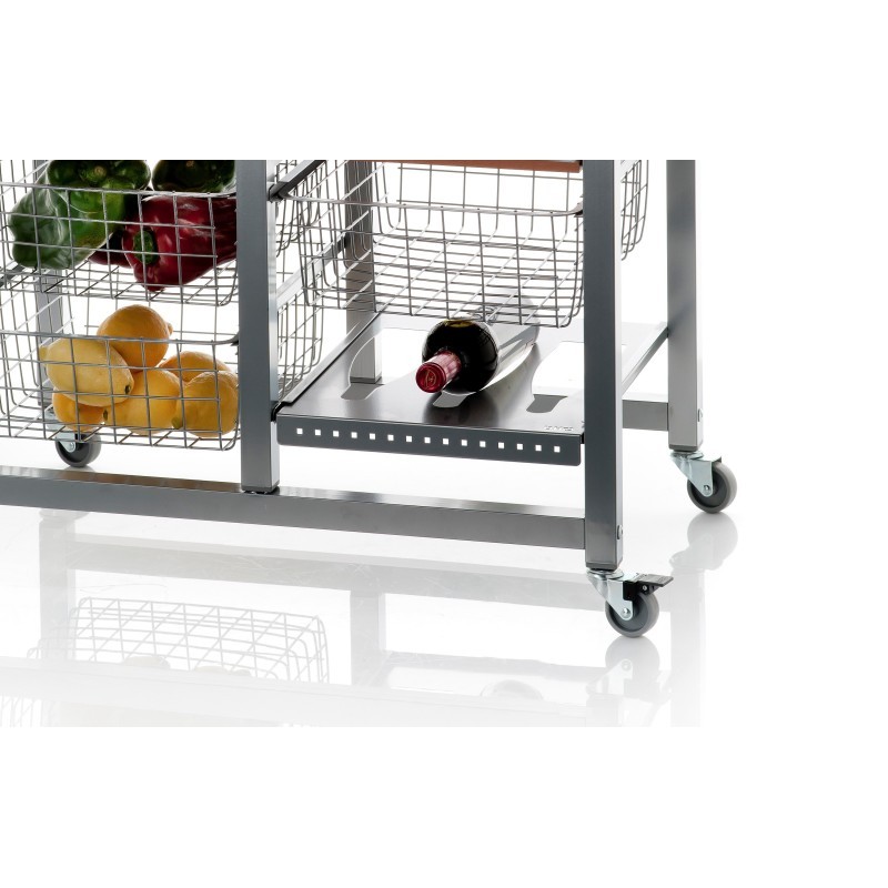 Lleva 1 amplia encimera, 3 cestas de gran capacidad, 2 prácticos cajones, 2 estantes intermedios, 1 estante botellero y 4 ruedas metálicas, dos de ellas con freno.