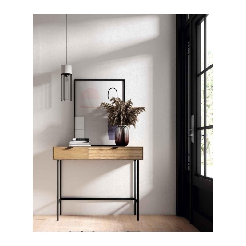 Cuenta con dos cajones de apertura suave gracias al sistema soft closing y guías metálicas ocultas, que refuerzan su calidad y durabilidad. Los tiradores metálicos negros, al igual que sus patas en el mismo acabado, aportan un contraste moderno y refinado.