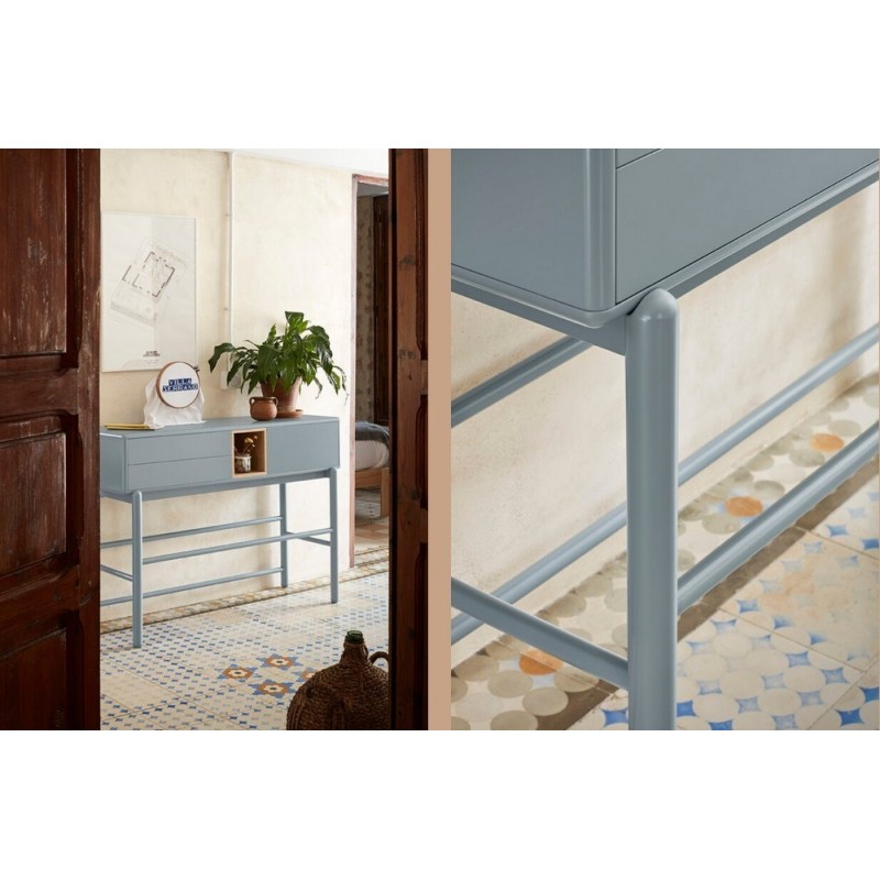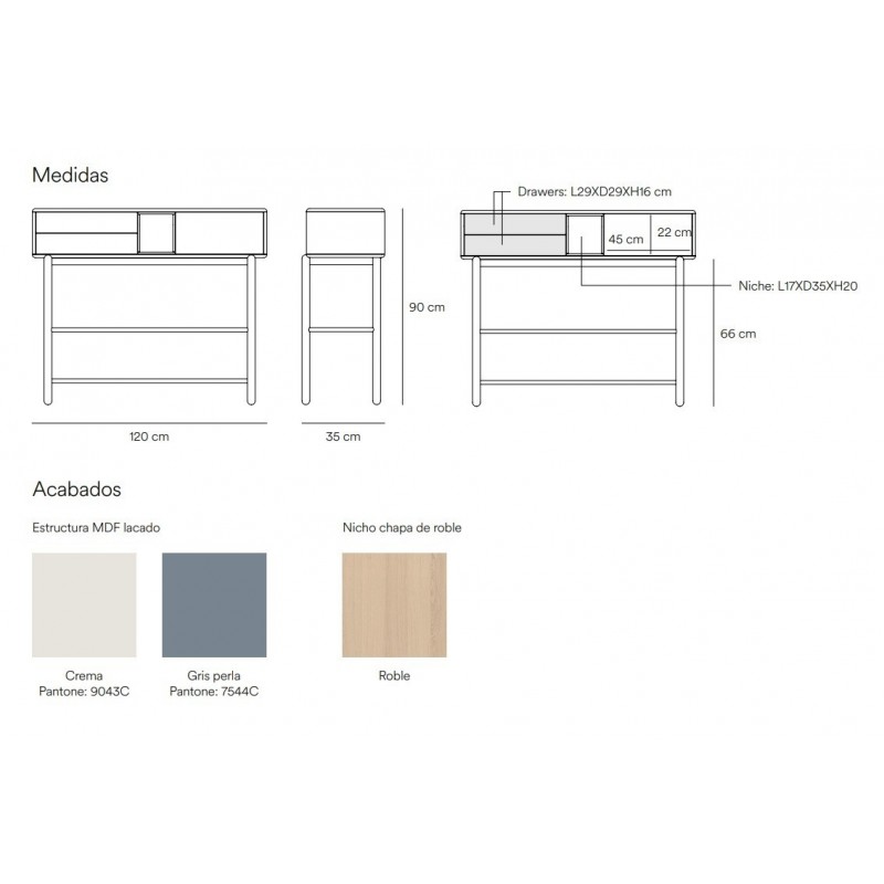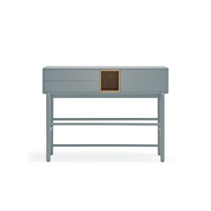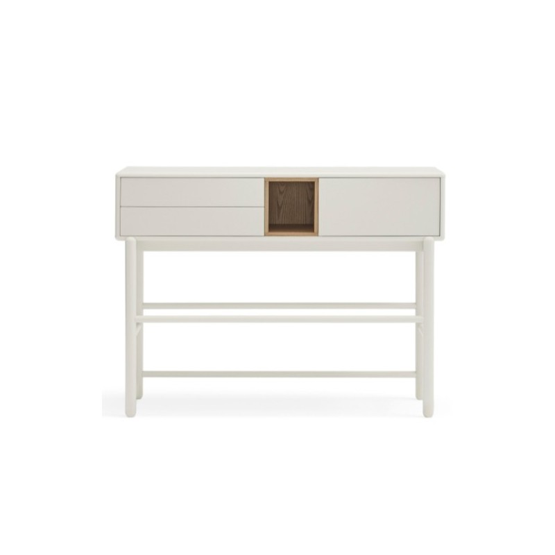 Mueble recibidor con dos cajones, una puerta con apertura mediante pulsador y un hueco chapado en roble natural.