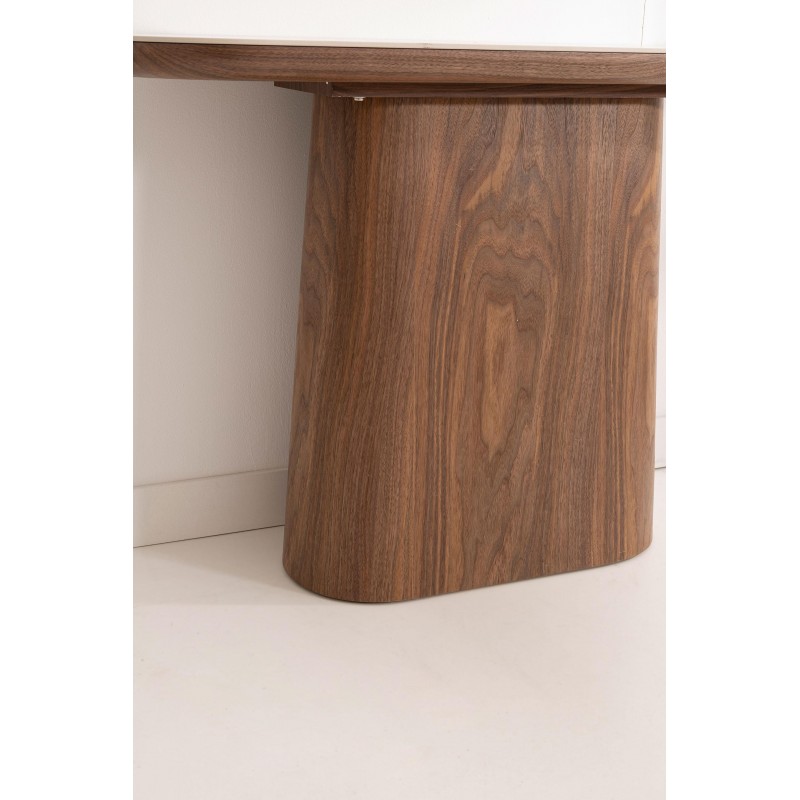 Su tapa de porcelánico blanco ofrece resistencia, fácil limpieza y un acabado elegante, mientras que la estructura de chapa de madera roble aporta calidez, robustez y estilo contemporáneo.