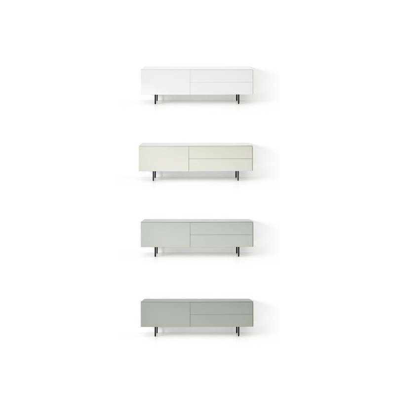 Mueble de tv con puerta y 2 cajones de frente liso acabado lacado mate disponible en 5 colores blanco, terra, perla, gris y verde oliva. Sistema Push de apertura. Pies de metal acabado negro