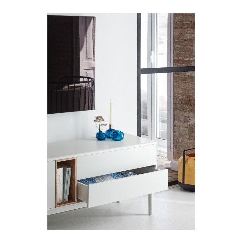 Mueble de Tv en Mdf lacado blanco crema o gris perla, hueco en madera de roble.