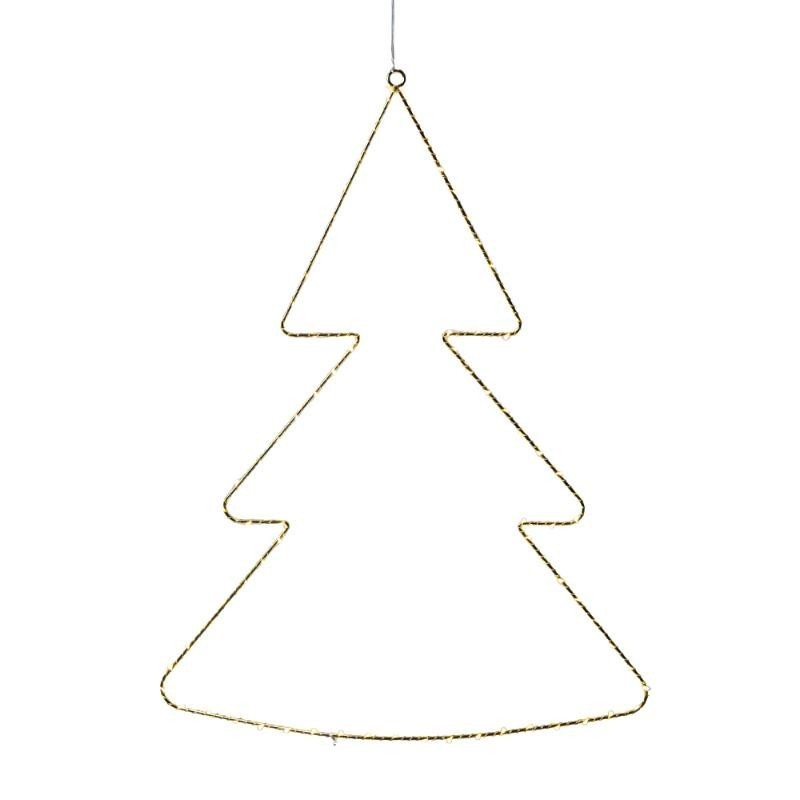 Adorno luminoso de metal dorado en forma de abeto, con 80 luces led. Funciona con pilas no incluidas.