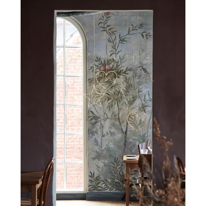 Esta hecho de metal y está equipado con 40 pequeñas luces LED en toda la decoración colgante. Desde su cuerda hasta alrededor de la decoración se pueden ver las lucecitas.