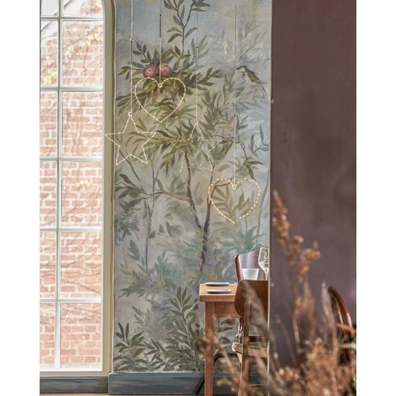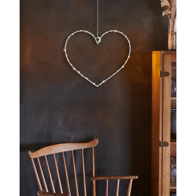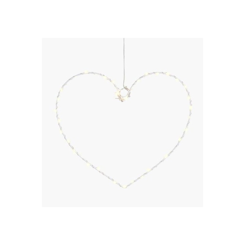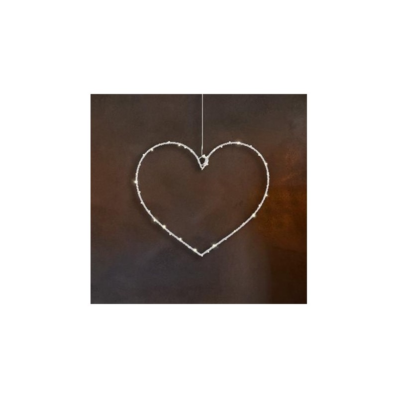 El corazón está hecho de metal y está equipado con 40 pequeñas luces LED en toda la decoración colgante. Desde su cuerda hasta alrededor de la decoración se pueden ver las lucecitas.