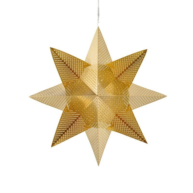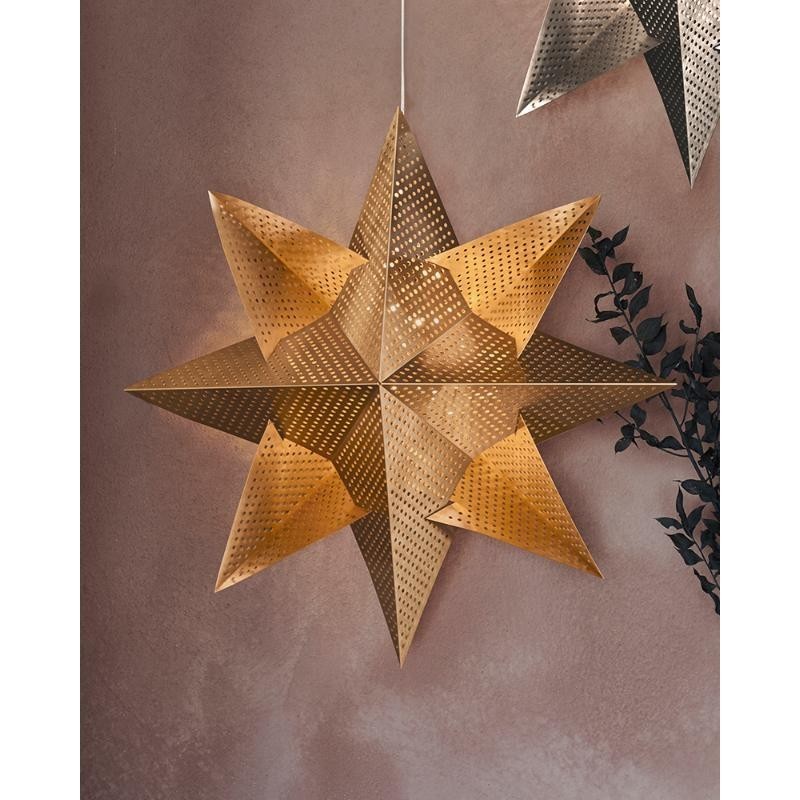 Estrella dorada para colgar con 20 luces Led en su interior. Funciona a pilas AAA no incluidas. 33cm de diámetro y 35 cm de cable. Apto para mando a distancia de control remoto de encendido