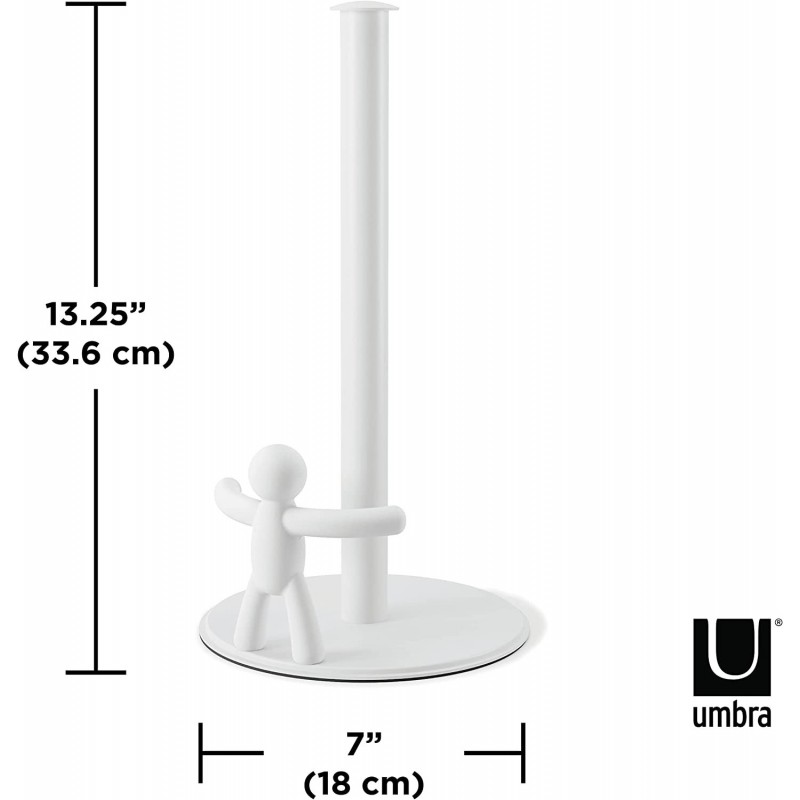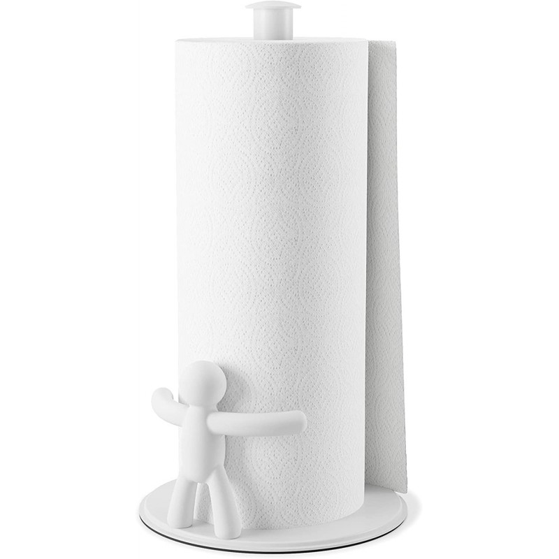 Soporte para papel de cocina hecho de metal y polipropileno moldeado suave y resistente, lo que le da un diseño resistente pero ligero
