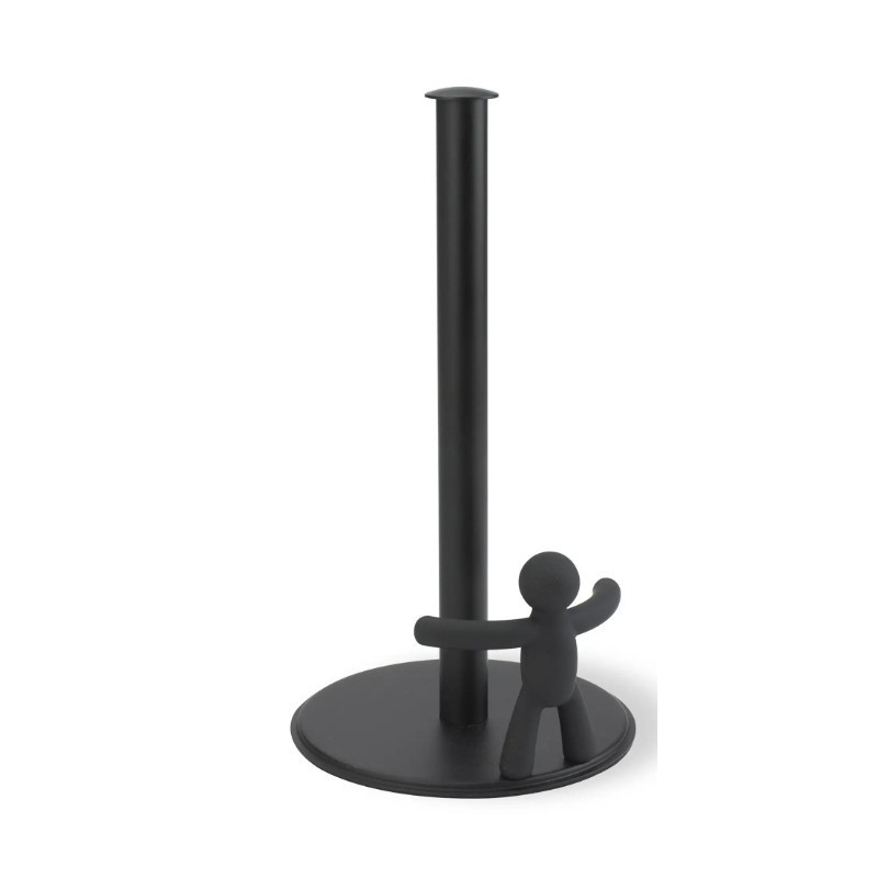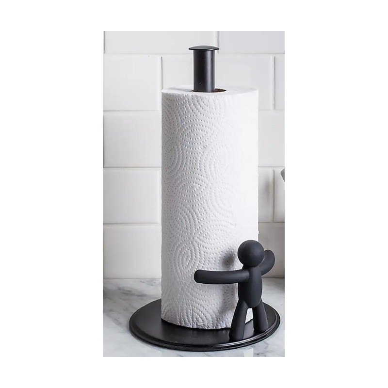 Soporte para papel de cocina hecho de metal y polipropileno moldeado suave y resistente, lo que le da un diseño resistente pero ligero