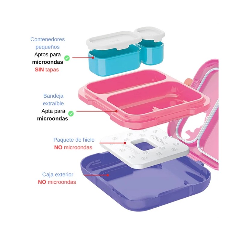 La bandeja extraíble y los dos contenedores son aptos para microondas sin tapas. El resto de los componentes no son aptos para microondas.