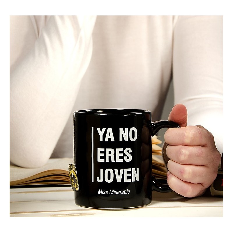 La taza existencialista "Ya no eres joven" es el regalo perfecto de cumpleaños. Incluso quien cumple 20 años piensa que su juventud ya ha terminado. Las crisis de los 30, de los 40, de los 50..., se suceden a lo largo de nuestra vida, porque la juventud es un estado mental que pocos son capaces de alcanzar. El mensaje de la taza nos recuerda nuestra fragilidad frente al paso del tiempo y nos ayuda a enfrentarnos mejor a nuestros miedos.