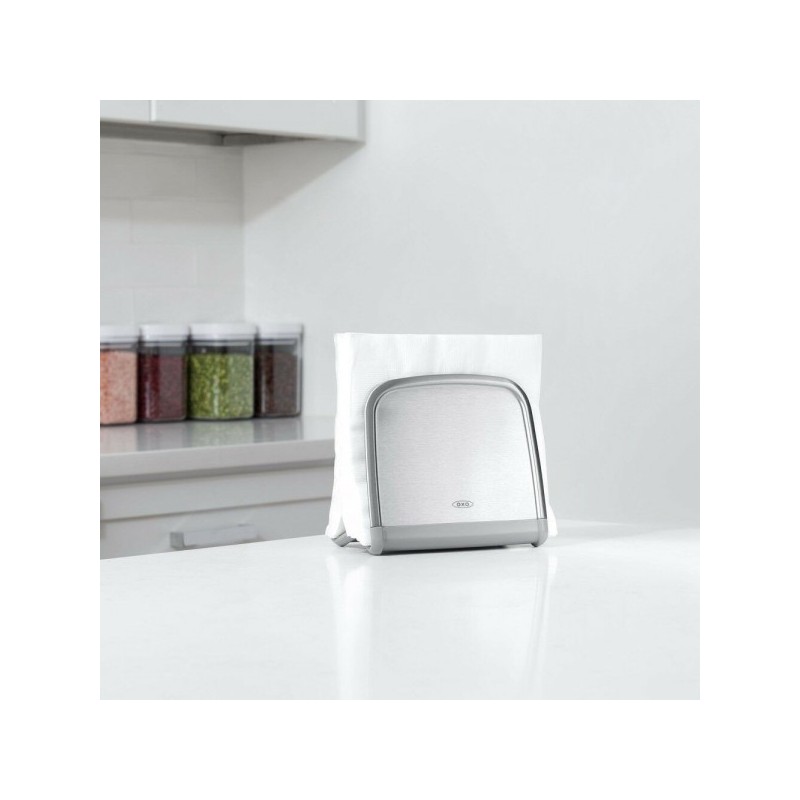 Soporte para servilletas, marca OXO, fabricado en acero inoxidable.