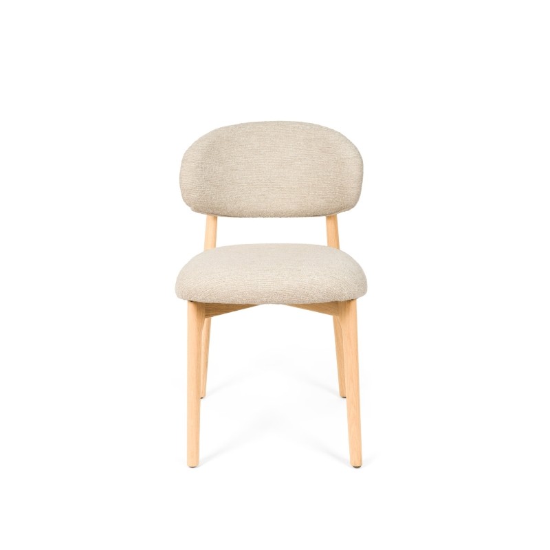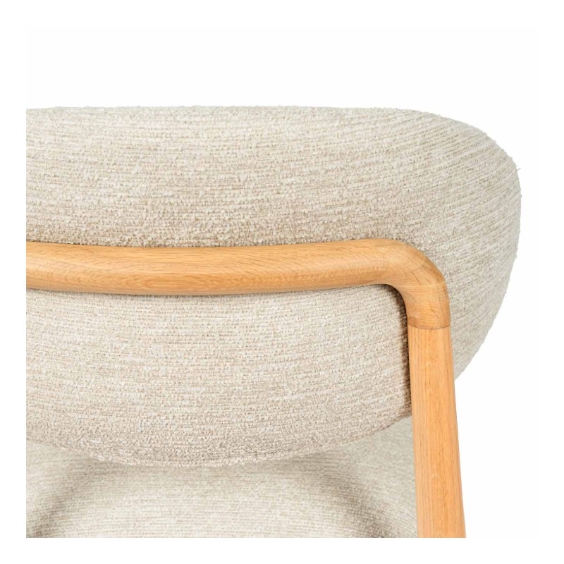 Apoyada sobre sólidas patas de madera de haya, su estructura transmite calidez y estabilidad, aportando un carácter sereno que encaja a la perfección en espacios contemporáneos, nórdicos o de inspiración orgánica.
