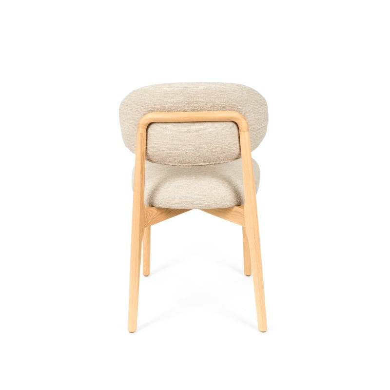 Pero es su parte trasera la que revela un detalle único: una estructura de madera vista que enmarca el respaldo con un diseño curvo y artesanal, convirtiendo la silla en un objeto decorativo incluso cuando se observa desde atrás.