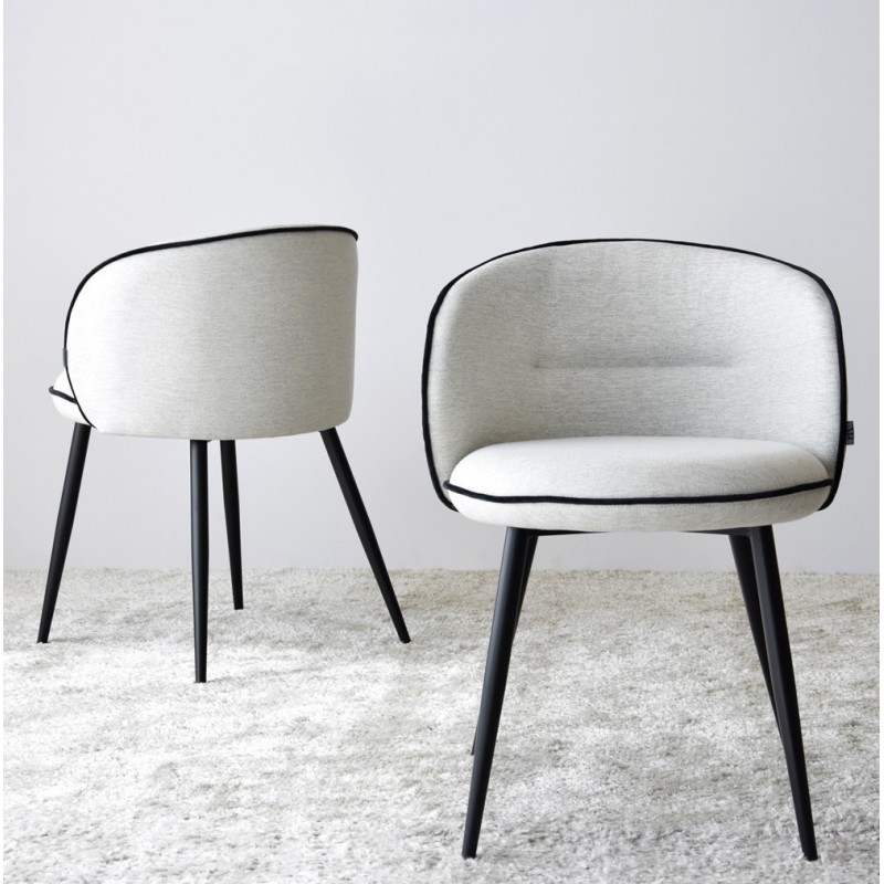 Silla de comedor tapizada en beige con detalle en terciopelo negro. Patas de metal lacado negro mate
