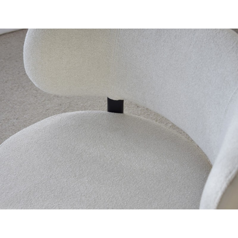 Silla con interior tapizado en tela con textura en color blanco roto y gris arena y trasera del respaldo en piel sintética color gris arena.