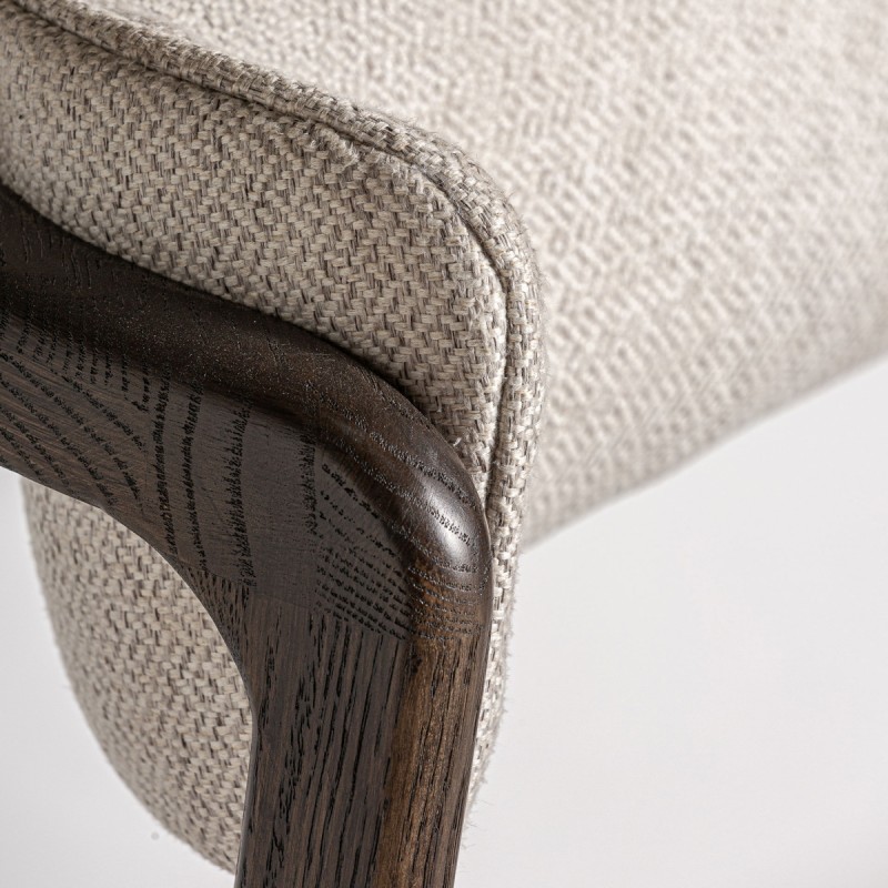 Fabricada en madera de fresno en color marrón y combinada con un asiento y respaldo en poliéster color beige, la silla Jerzen equilibra la calidez de la madera con la suavidad de sus textiles.