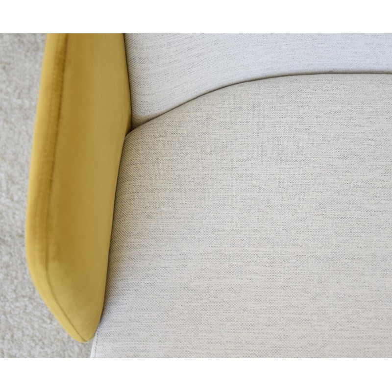 Silla de comedor con brazos y respaldo envolvente. Parte interior tapizada en beige, brazos y trasera en ocre. Patas de madera negra con embellecedor de metal negro