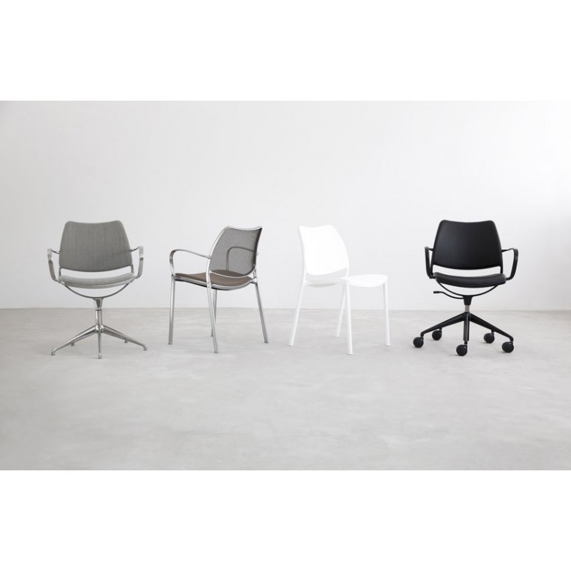 El asiento y respaldo pueden ser en polipropileno o tapizados en tela o piel .