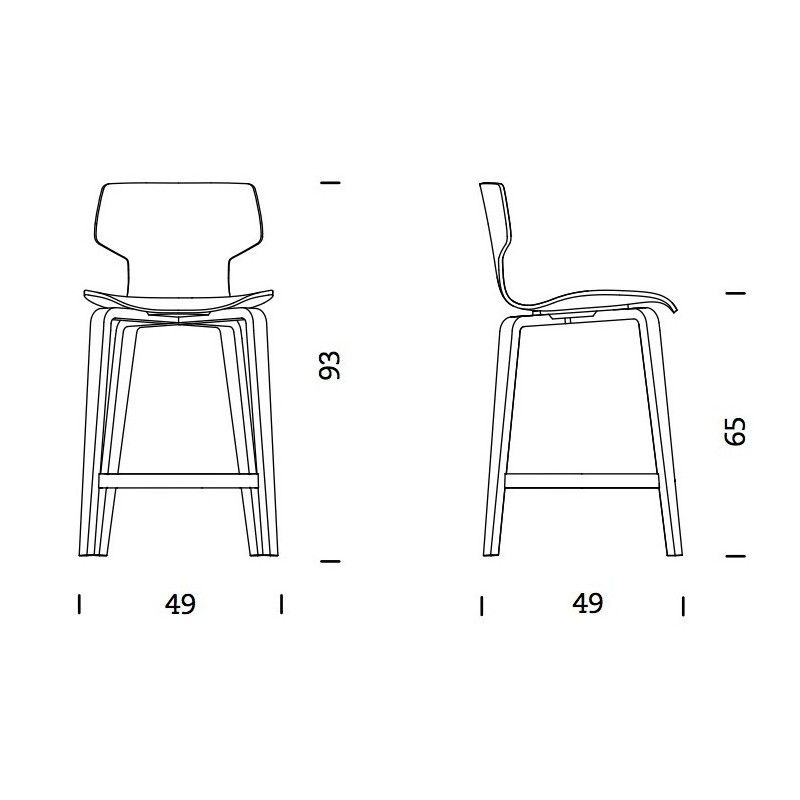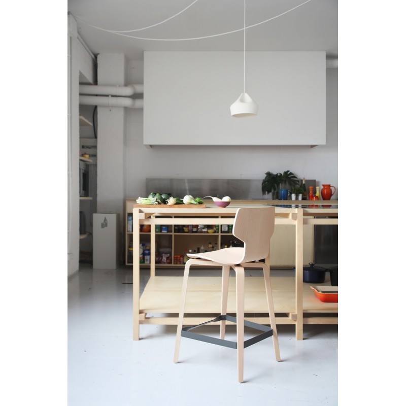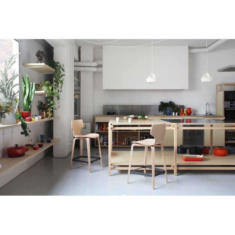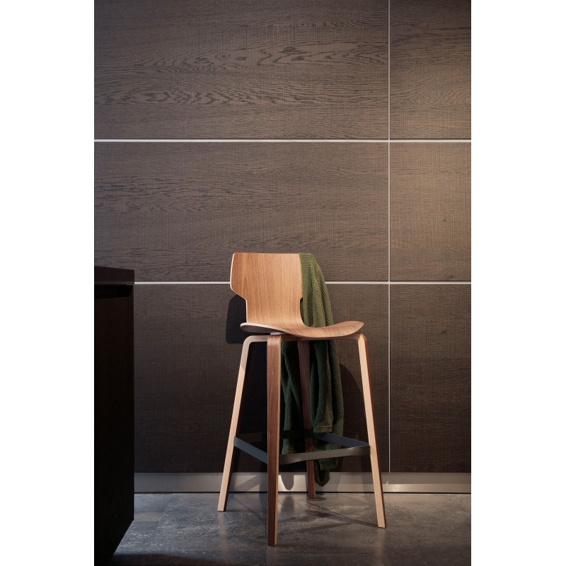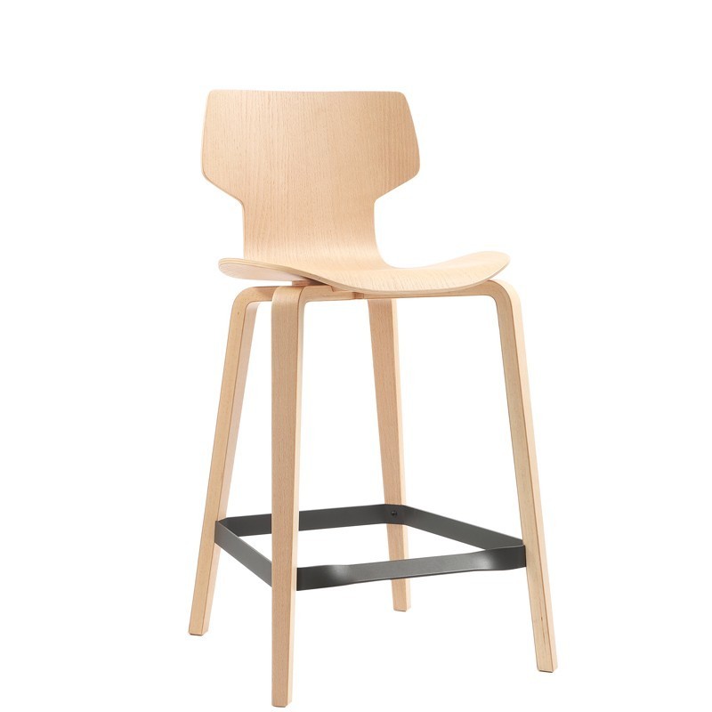 Taburete de madera contrachapada de roble o nogal con reposapiés de acero pintado color gris.