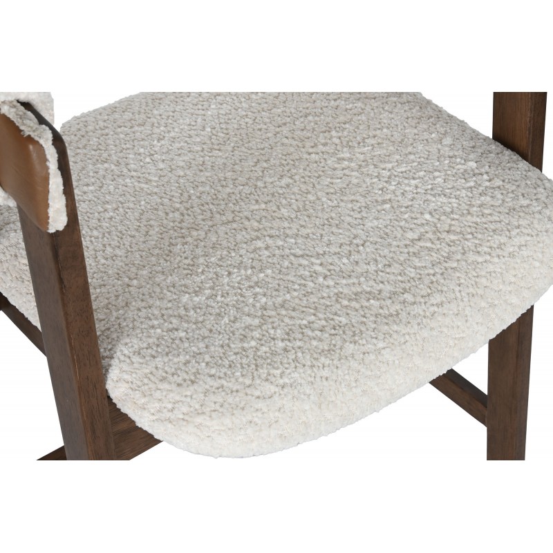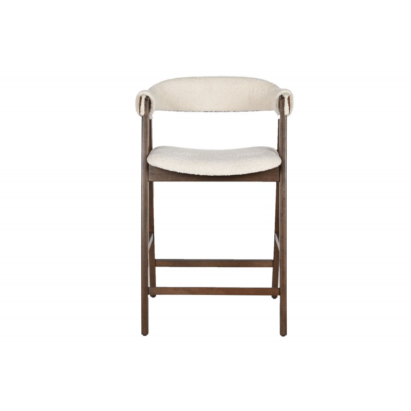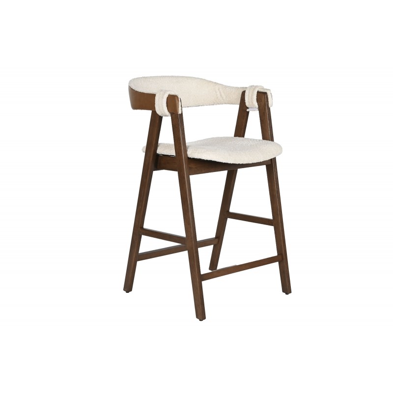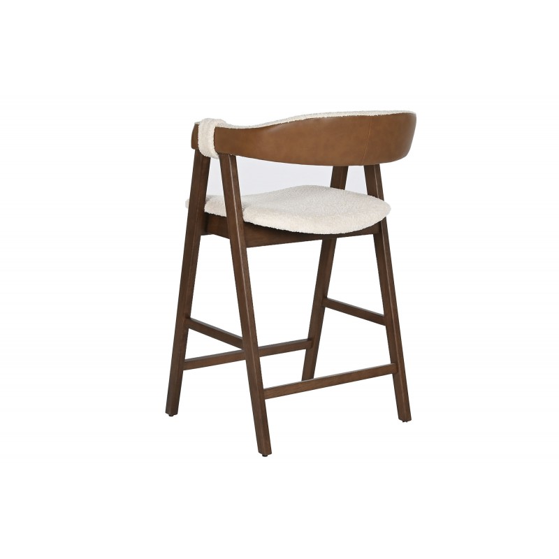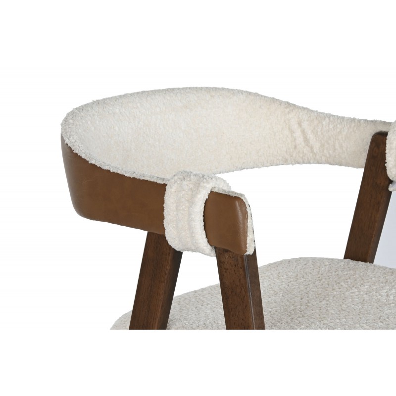 Taburete de madera de caucho con asiento y respaldo tapizados en piel sintética y borreguito blanco.