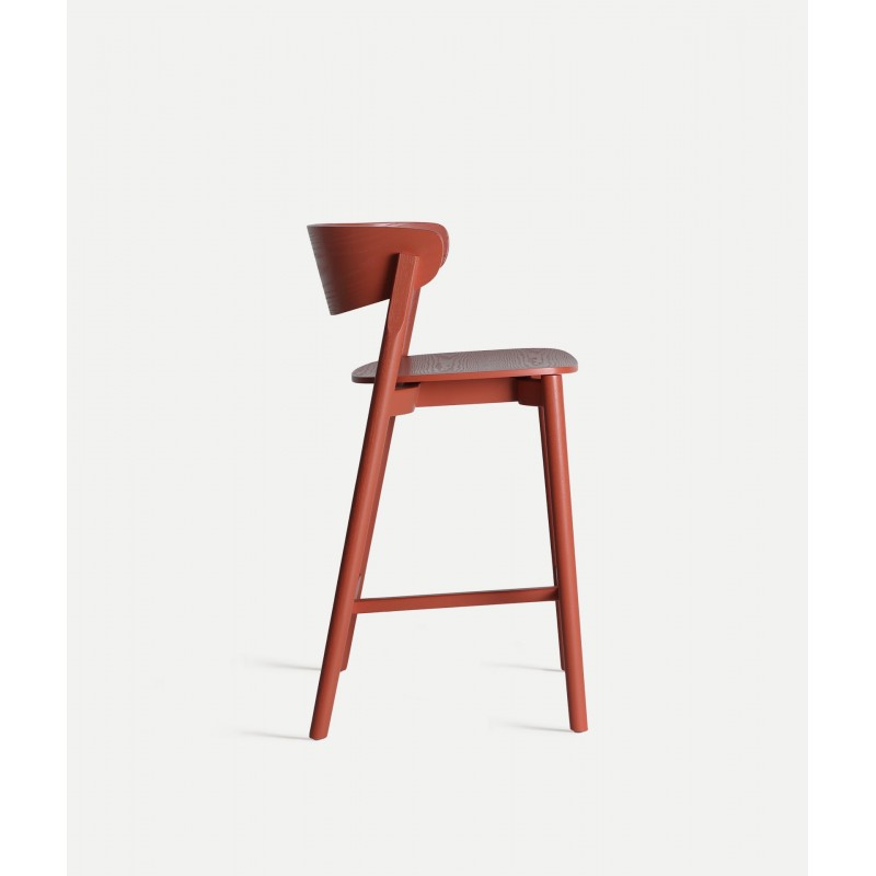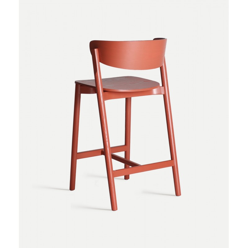 Taburete fabricado en madera de fresno con acabado coral, combina líneas rectas con una curva envolvente en el respaldo que aporta comodidad y estilo.