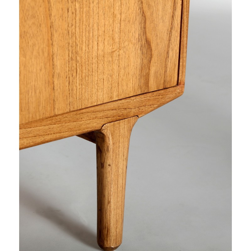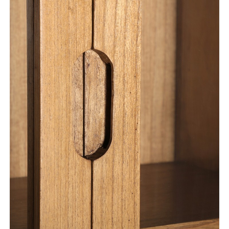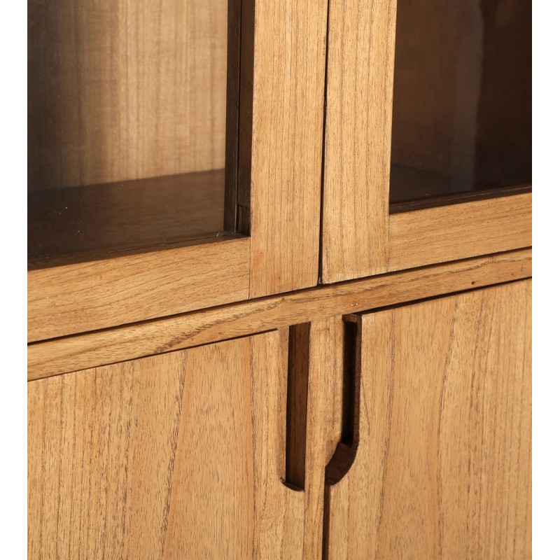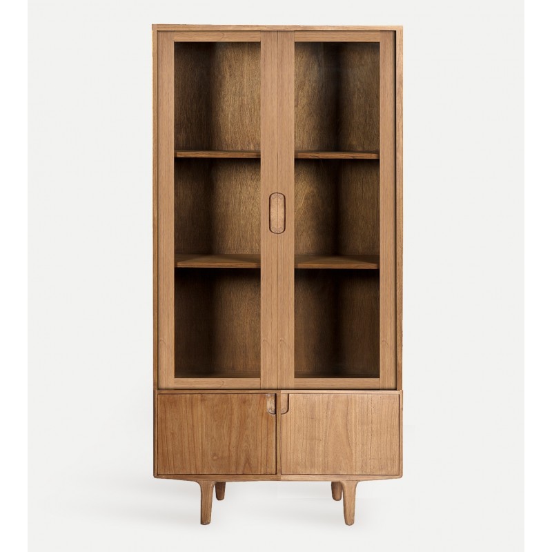 Fabricado en madera mindi, madera contrachapada y cristal, su acabado marrón claro y su diseño con vitrinas aportan ligereza visual, ideal para mantener orden y estilo en el hogar.