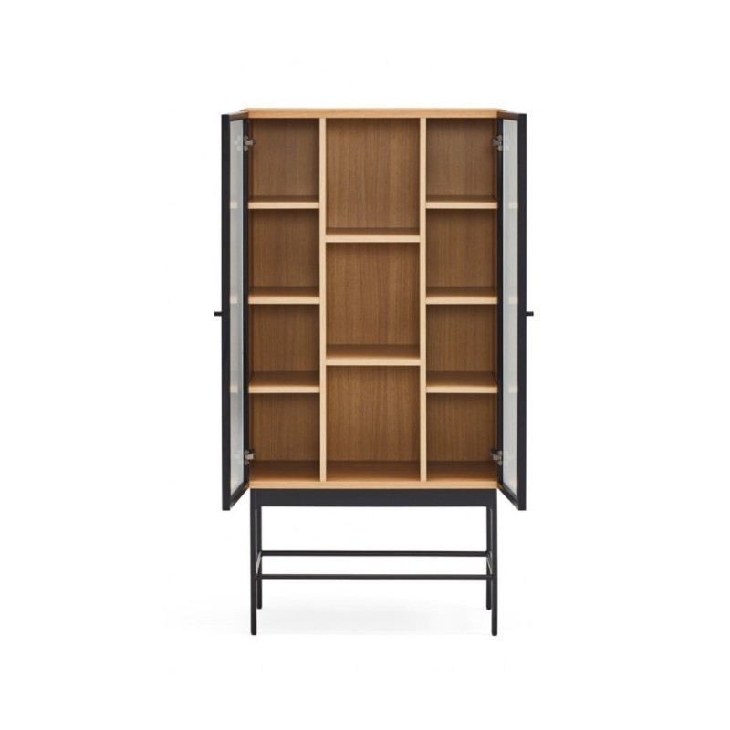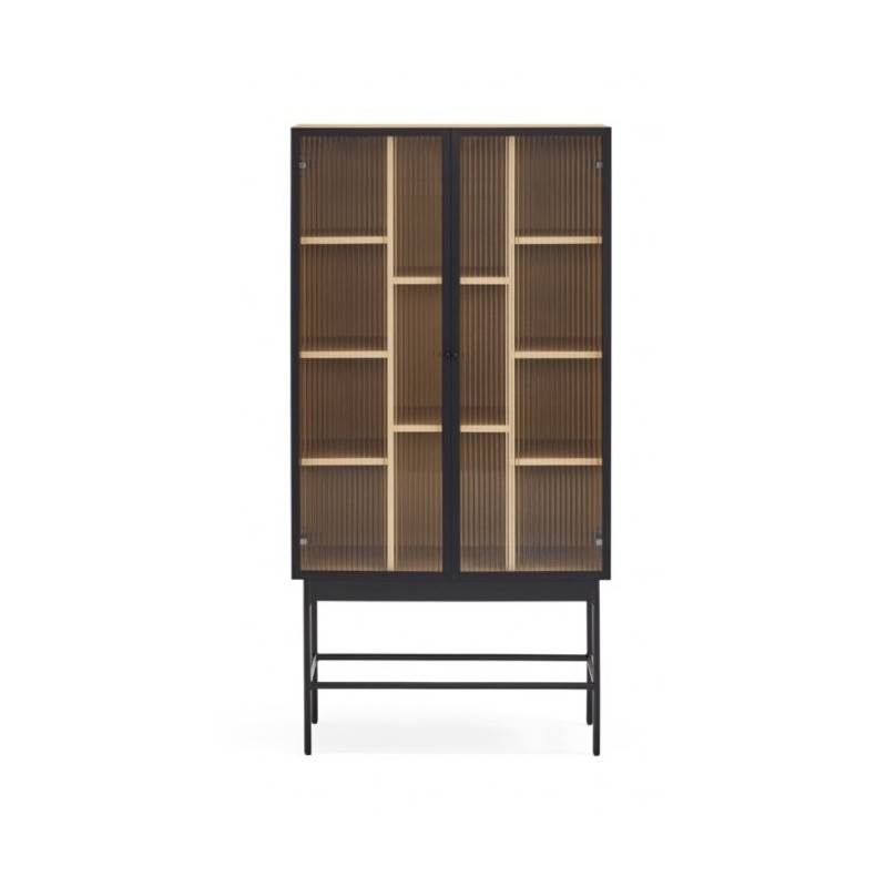 Fabricado en DM, patas metálicas y puertas de cristal estriado con tirador circular integrado.